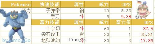 No.9 怪力:初代的斗系代表, 最適合針對卡比獸,在Go中并沒有想象中的強力,快速技能威力偏低,不過還好速度快,集氣效率高,蓄力技能十字切排第一,是DPS最高的蓄力技能。然而腕力出率偏低,所以獲取困難。