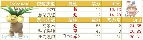 No.3 椰蛋樹:在原作中,麻痹,睡眠,寄生種子加上不俗的輸出讓椰蛋樹通常作為開場寵打開局面,唯一的劣勢是速度太慢。然而這個劣勢在Go中消失不見,也借此成功碾壓了初代超系代表胡地。不過由于蛋蛋出率較低,獲取難度偏高。