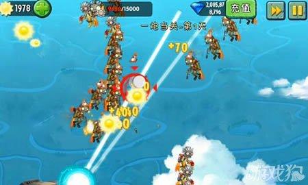 玩法:使用艦載大炮擊殺僵尸達成指定分數即通關。大炮有三種類型可選,分別是單發、激光和導彈群,每次發射需要消耗不同數量的陽光。擊殺不同僵尸種類可以獲得不同數量的陽光。陽光用完游戲就結束了!