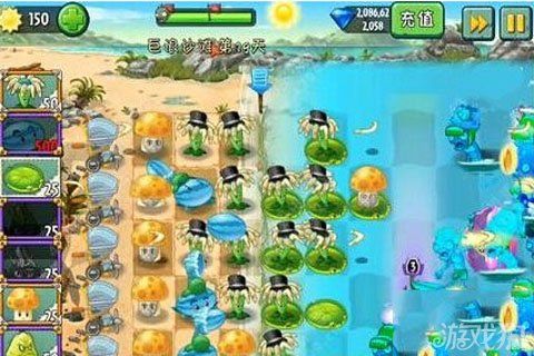 2、有了減速的冰西瓜我們可以慢慢的布陣,依然用纏繞水草進行牽制浮潛僵尸和沖浪僵尸,這邊有一個小技巧就是利用陽光蘑菇種植在稍微前面的位置,作用就是讓漁夫僵尸勾!(障眼法,如果勾你一個冰西瓜不是會哭出來,后續還要挖走蘑菇種植其他植物)