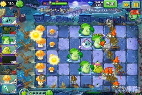 這一關沒有墓碑,所有不用帶噬碑藤!所以前期陽光會有點匱乏,這里小編就使用菜問和冰凍生菜(3階可攻擊,免費隨便用)進行守,這樣的問題就會出現(xiàn)(后期太乏力了)陽光的補充就選擇陽光菇了,記得種兩列~~這樣就能確保陽光充足。
