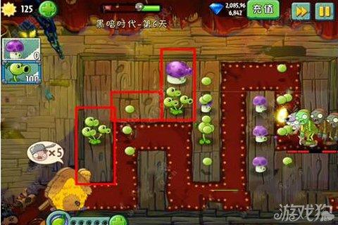 這一關的僵尸比較危險的就是那個拿著火把的僵尸,因為他一靠近就可以秒殺植物,所以小編在下面畫了紅色區域是相對比較安全的地點。盡量將植物升級滿,這樣在前期秒殺僵尸是非常容易的!(殺死僵尸能夠獲得陽光)