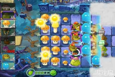 植物大戰僵尸2黑暗時代第27天圖文攻略,本關是有霧氣的,所以需要我們來利用路燈花照明,首先來種太陽菇這是毋庸置疑的,本關在開始的時候我們要發展自己的資源,差不多的時候就需要用路燈花幫助了。