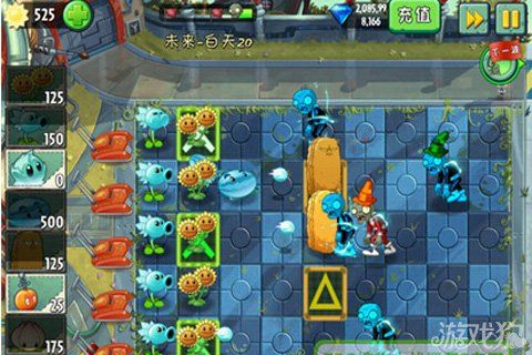 前排高堅果來擋住敵人,后面寒冰射手,能量豆給太陽花然后種冰西瓜來對付,本關采用的策略是厲害減速加攻擊。