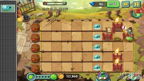 大家要注意了不要讓僵尸噴到炸藥桶,這一關是傳送帶模式,前面幾個植物是免費的寒冰射手。寒冰豆子用來消滅火把僵尸,這一關火把僵尸非常討厭。