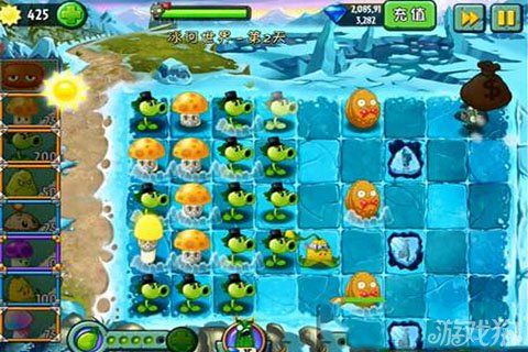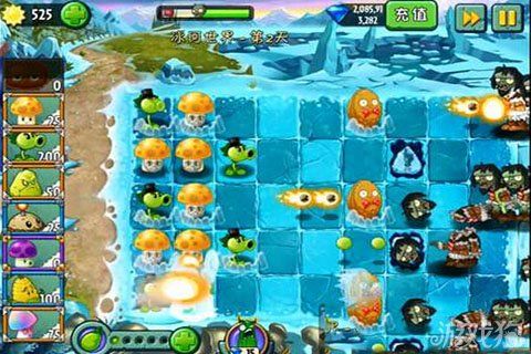 本關開始的時候難度不大,不過當寒風吹來之后就會出現上圖的情況,植物被凍住,那么我們如何來解凍呢。首先需要的是烤馬鈴薯,它可以起到解熱的效果,如果時間不夠,那么也可以讓后排的植物來攻擊前面的植物身上的冰塊,所以我們需要在后排種上遠程攻擊的植物。