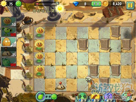 最新出現的火炬僵尸速度比較快,兩個植物才能消滅它。每關的首要任務都是種植太陽,出來的第一關僵尸可以在后方種土豆雷來消滅它。