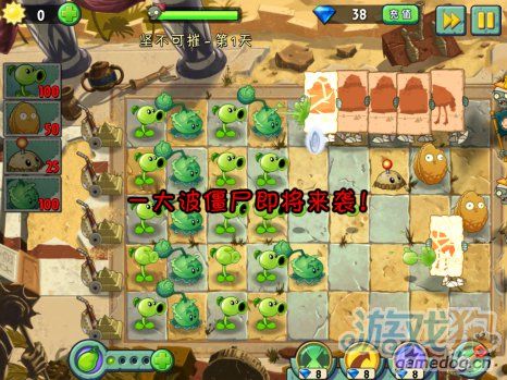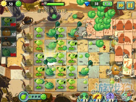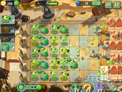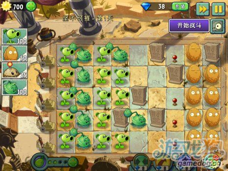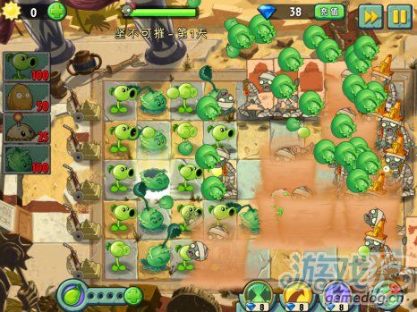 植物大戰(zhàn)僵尸2神秘埃及堅(jiān)不可摧第1天攻略,這關(guān)沒(méi)有太陽(yáng)花,出場(chǎng)的時(shí)候總共給了3250個(gè)太陽(yáng),你需要的就是利用這些有限的太陽(yáng)去消滅所有的僵尸。首先,我們把包菜投手和豌豆射手種在后面,前面種上堅(jiān)果。