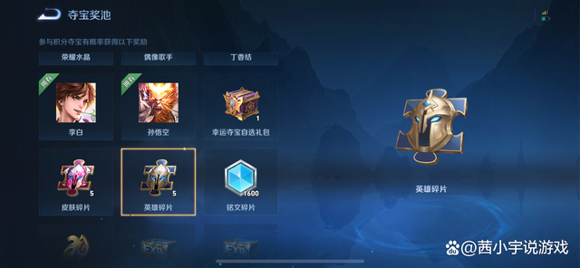 2、在商城的積分奪寶頁面中,奪寶的獎池里面包含了英雄碎片的,玩家可以使用60榮耀積分抽取1次,或者是270榮耀積分抽取5次來獲得。