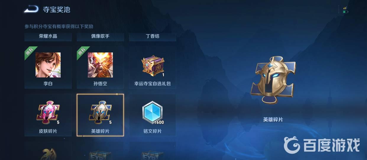2、在商城的積分奪寶頁面中,奪寶的獎池里面包含了英雄碎片的,玩家可以使用60榮耀積分抽取1次,或者是270榮耀積分抽取5次來獲得。