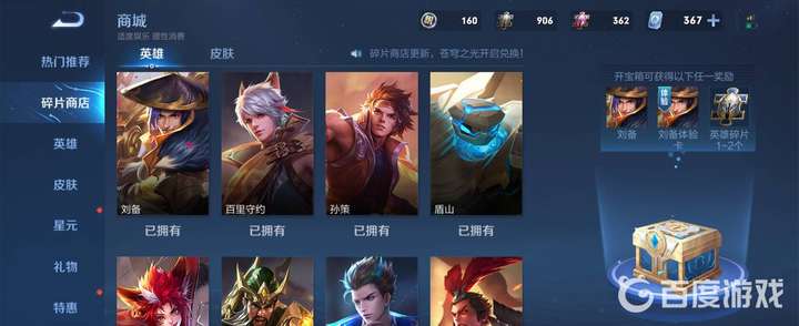 3、使用點(diǎn)券抽獎,有可能抽到英雄碎片,也有很多開寶箱的活動,也有可能開到英雄碎片。