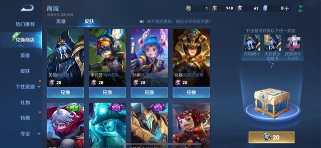 第六種方法,商城中的兌換商店也有機會獲得皮膚碎片甚至是皮膚。