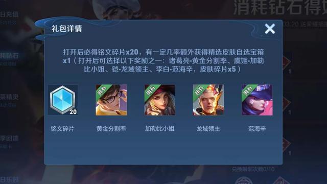 而禮包中一般都有永久皮膚,比如前一段時間開啟的鉆石消耗活動,就放出了諸葛亮的黃金分割率作為獎勵。