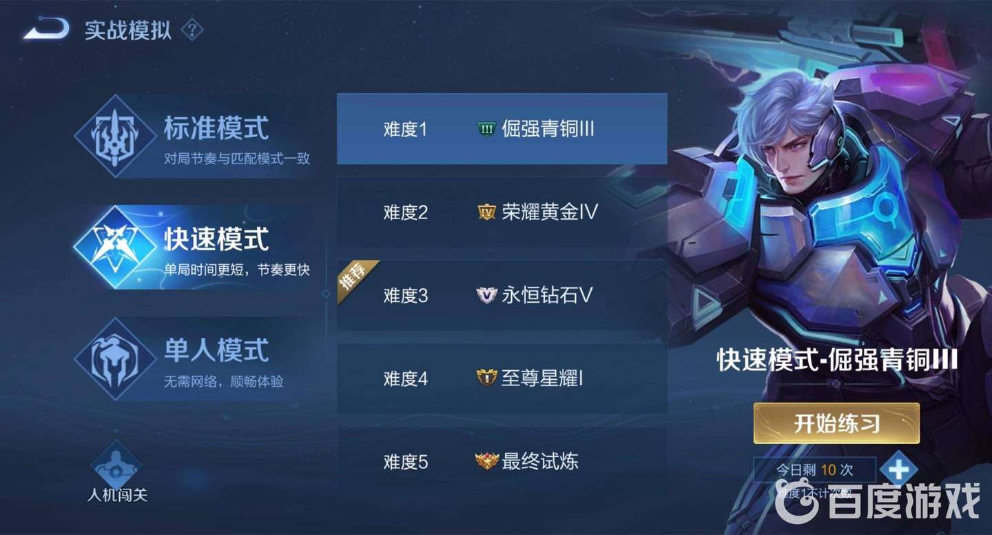 實戰模擬模式位于實戰5v5人機處,快速模式是最佳的刷取熟練度的方式。不同檔次的人機對應的熟練度上限不同,但由于難易問題,在刷熟練度時的選擇應該為:難度1對應白-藍標,難度4對應藍-紫標題,難度5對應紫-紅標。
