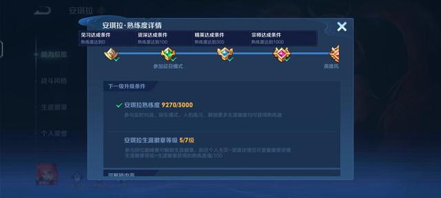 2、生涯徽章等級(jí)達(dá)到10.生涯徽章可以通過(guò)參與排位巔峰賽獲得,可前往個(gè)人主頁(yè)-英雄詳情頁(yè)查看徽章詳情,生涯徽章等級(jí)=生涯徽章獲得的熟練度值/100.