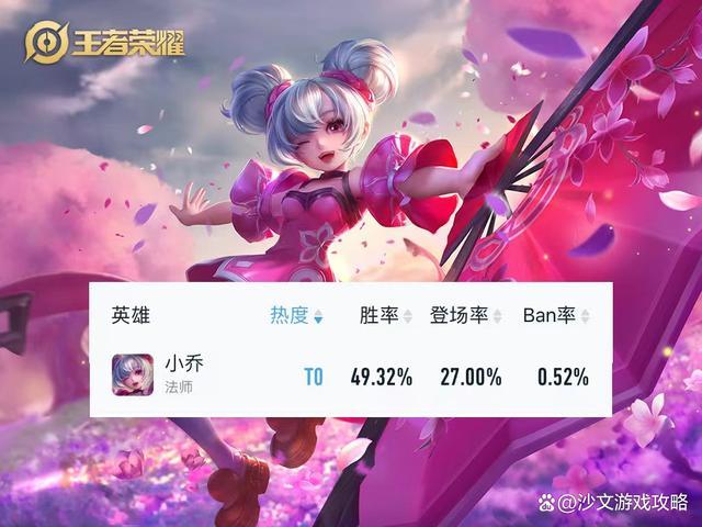排名第二的小喬,勝率為49.32%,ban率僅為0.52%,登場率為27%。小喬的技能也是簡單易操作,而且輸出穩定就算是劣勢清線能力也很強,優勢局的小喬終結比賽的能力是比較優秀的,不管是是蹲草還是團戰對后排的威脅都比較大。不過當前版本表現比較乏力,總感覺傷害差一些。