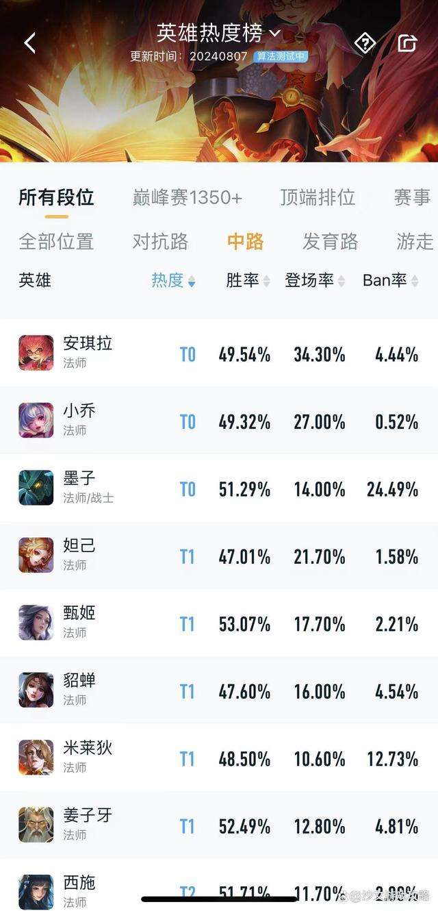 從8月7日最新的英雄中路法師熱度榜中,可以看到當前當前熱度榜前五的英雄正是她們五個。