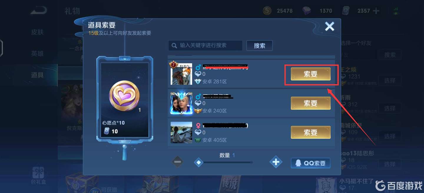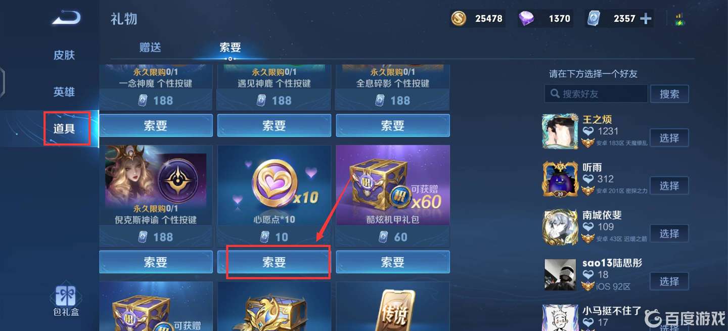4.在跳出來的頁面中選擇一位好友,點擊右側的索要,即可發(fā)送索要消息。