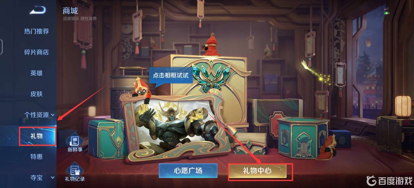 3、心愿點贈送位置在商城-禮物-禮物中心處,選擇好友即可贈送心愿點,贈送好友已擁有的皮膚也會自動轉化成對應價格的心愿點。
