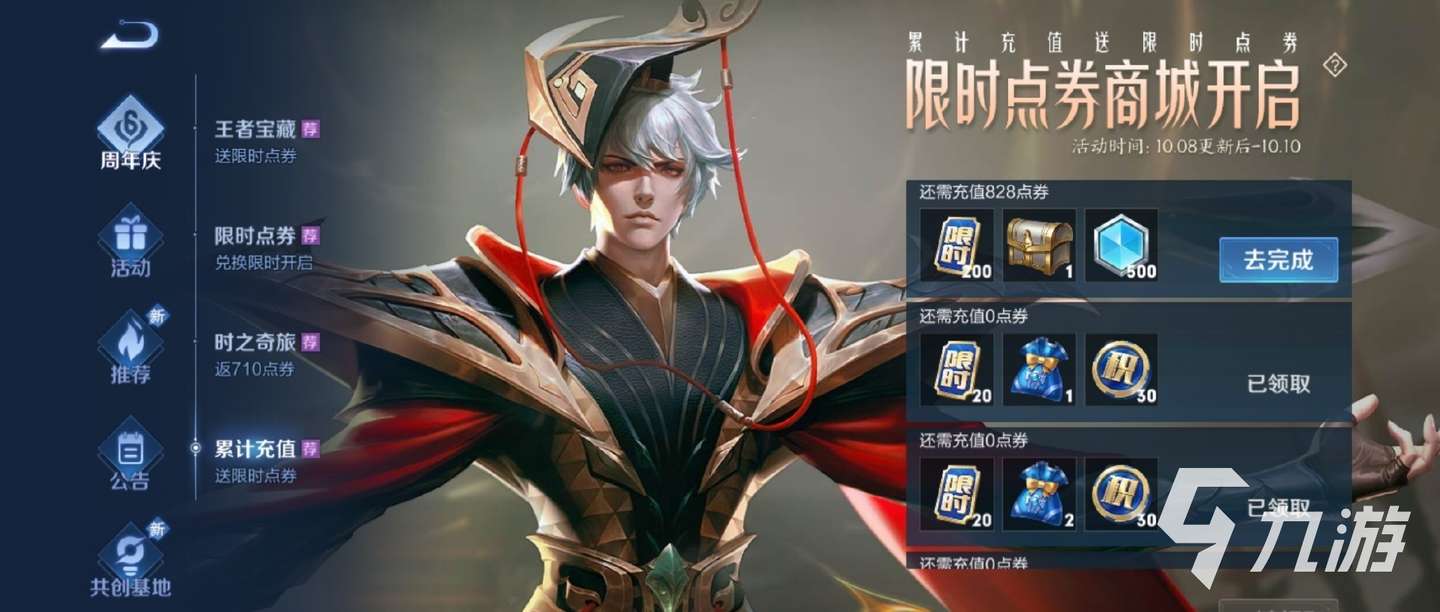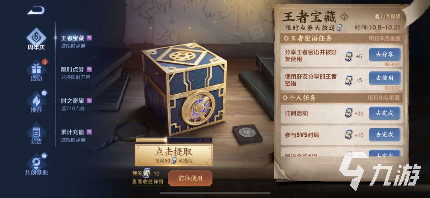 小編先簡述一下免費點券獲得的途徑共兩個,一個是參與游戲內的“王者寶藏”活動入口,通過完成日常的登錄、對戰、社交好友等類型的任務獲得,完成任務越多,獲得的點券越多,上限是1000個【限時點券】。另一個途徑是充值時贈送,具體看圖: