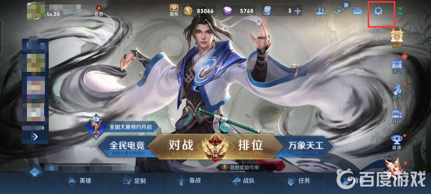第一步:在王者榮耀的首頁點擊右上角設置。