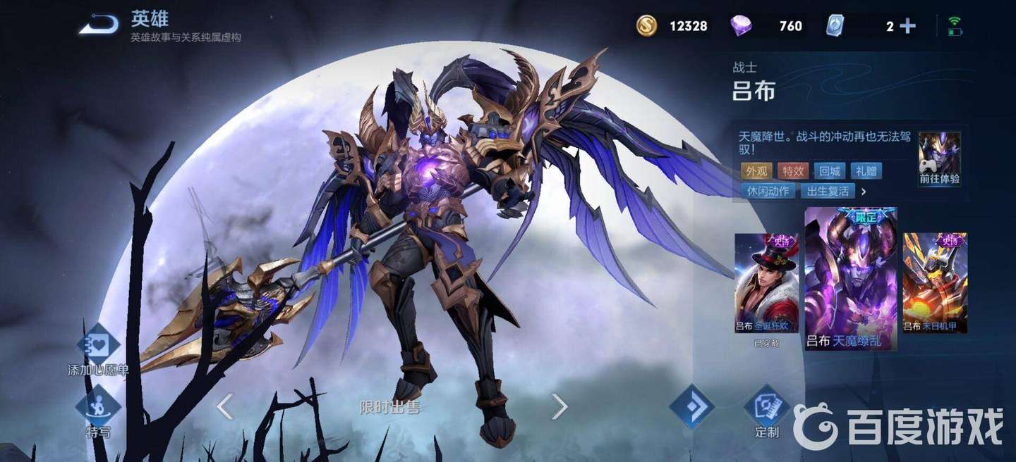 5、呂布天魔繚亂。呂布的天魔繚亂這款限定皮膚,這款皮膚主體的色調是暗藍色的,所以其大招的范圍感覺會非常遠,許多呂布玩家都喜歡這款皮膚,手感會非常好