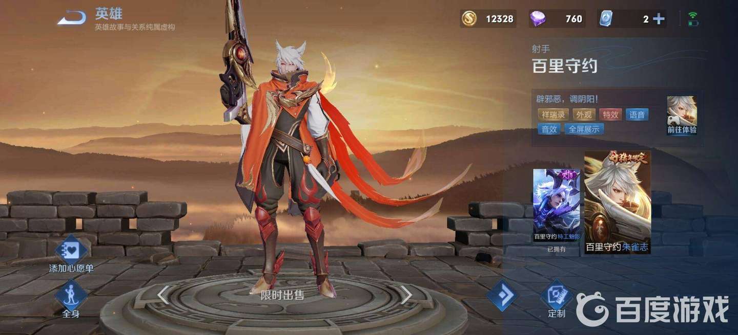 6、朱雀志。百里守約的朱雀志這款限定皮膚,這款皮膚主體采用的是金色的元素,百里守約人物的建模因此變得更加帥氣,強化了人物頭上的耳朵和尾巴。