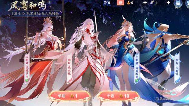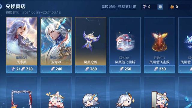 李白的鳳求凰需要720個羽毛或者兩塊令牌才能兌換,星傳說則只需要270個羽毛兌換。王昭君的鳳凰于飛需要1個令牌或者360個羽毛兌換,一整套星元則只需要120個羽毛即可兌換。