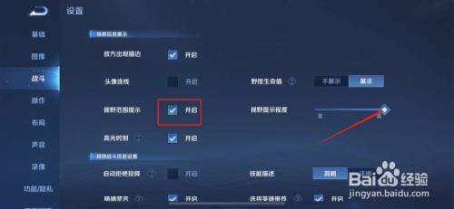 3 進入戰斗設置后,找到視野范圍提示,點擊開啟,并將視野提示程度拉到最高,即可設置視野范圍最大。
