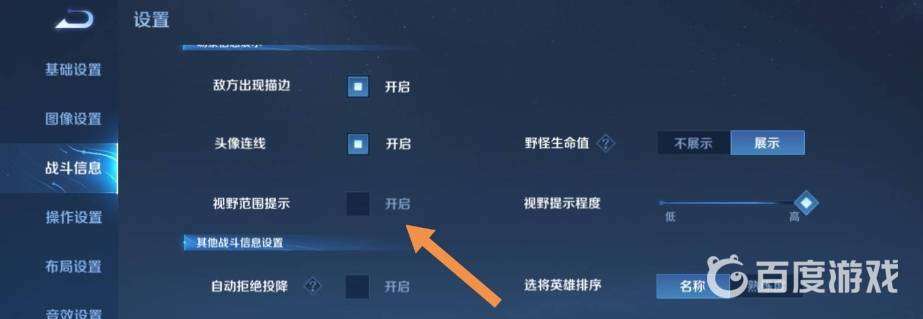 步驟三:在戰斗選項中,找到場景信息展展示下的視野范圍提示,關閉即可。
