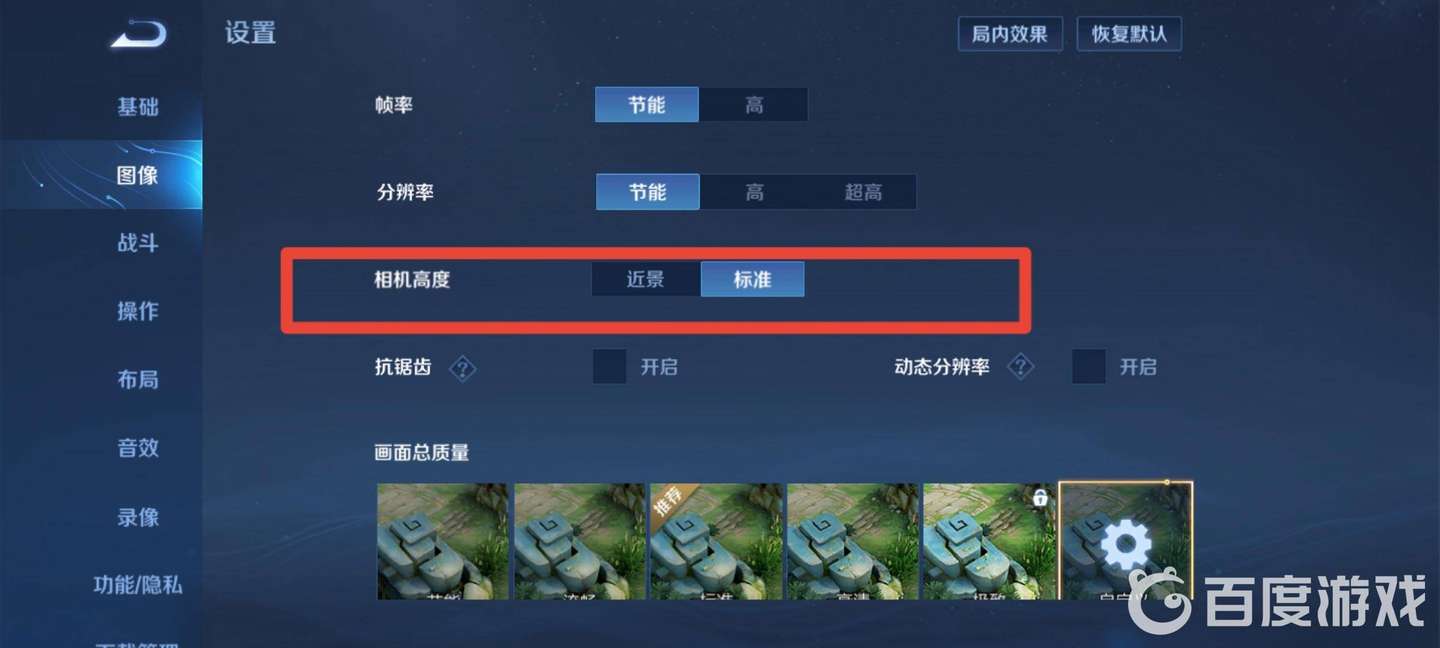 3、在圖像設(shè)置中找到相機(jī)高度,選擇近可以將游戲界面放大,選擇標(biāo)準(zhǔn)是正常大小的游戲界面,可以根據(jù)需要調(diào)整。