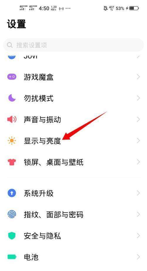 1、打開手機(jī)的設(shè)置,點(diǎn)擊“顯示與亮度”。