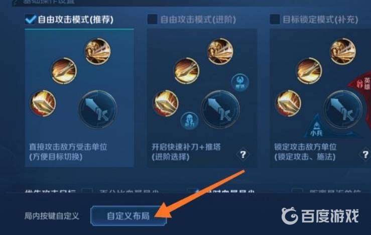 3、進入操作設置界面后,在界面下方有1個【自定義布局】的選項,這是更新游戲之后新上線的一些功能,點一下就可以進入按鍵設置界面;