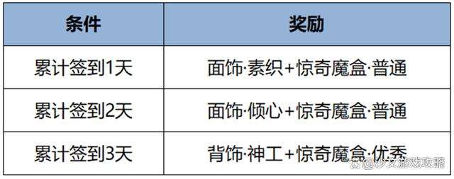 最后版本更新后,周末3天登錄送飾品活動,本周五至周天,累計簽到送元流之子飾品(面飾·素織、面飾·傾心、背飾·神工)及驚奇魔盒!活動時間:7月5日00:00-7月7日,活動入口:游戲大廳-新版本活動-精彩活動,如領(lǐng)取飾品獎勵時還未前往稷下廣場創(chuàng)角,獎勵將發(fā)放至背包,完成創(chuàng)角后進入背包使用即可領(lǐng)取獎勵。