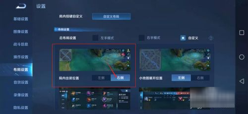 4、在右側設置中找到局內出裝位置,點擊并選擇右側即可將局內出裝的位置調整到屏幕右邊去。
