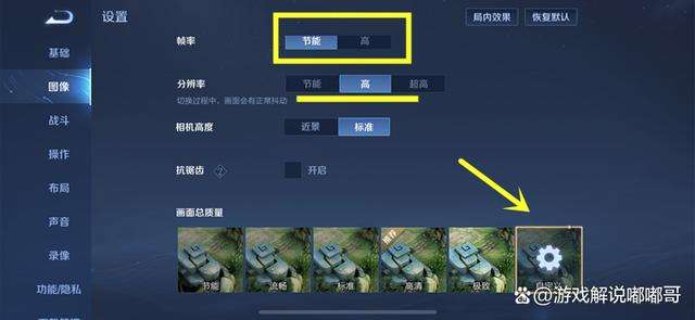 幀率設置好之后,就要對分辨率進行調整了,分辨率分為節能、高、超高,當然了選擇超高的選項,在游戲中的清晰度更高,但是對手機的配置要求也很高,其實選擇高分辨率的選項就可以了,分辨率選過之后,下面會有抗齒輪的選項,玩家可以選擇開啟和關閉。