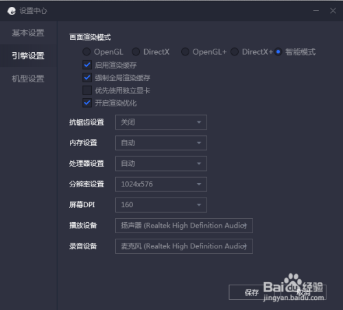 2 然后就進入了設置中心,我們點擊引擎設置,屏幕dpi改為160.智能模式,啟用渲染緩存,強制全局渲染緩存,開局渲染優化。