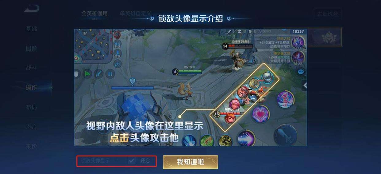 ①在 “操作” 設(shè)置中,還有一個 “鎖敵頭像顯示” 選項。開啟這個選項后,當 敵方英雄出現(xiàn)在視野范圍內(nèi)時,他們的頭像會顯示在屏幕上。