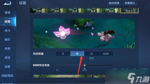 3、接著是特效質量的調整,選擇中間位置,調整好之后,在對局當中就會顯示血量了。