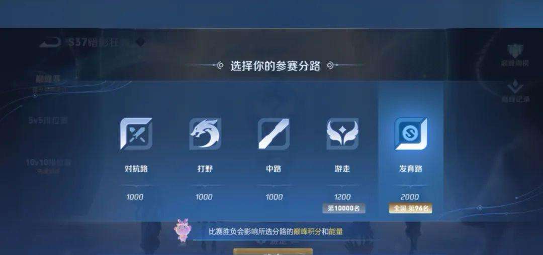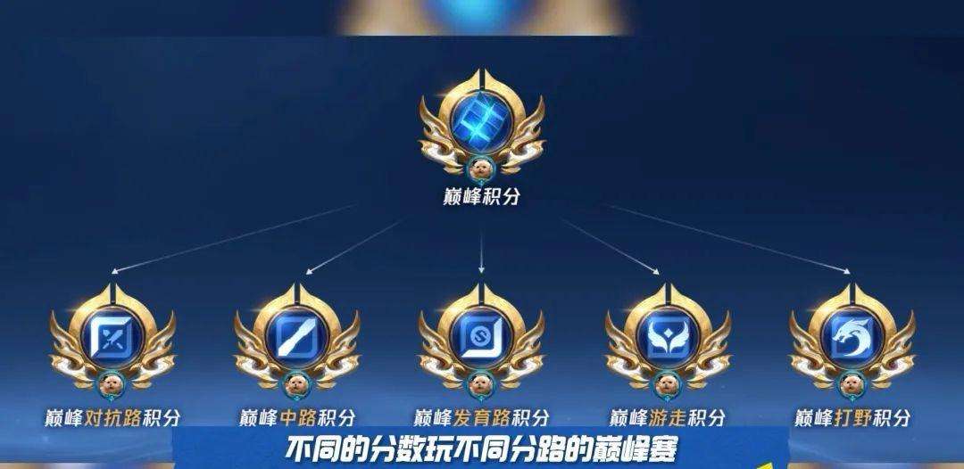 S39賽季前,巔峰賽玩家共用一個巔峰榜單,常出現玩家被分配到次選分路甚至補位的情況,導致游戲體驗不佳 。S39賽季徹底改變這一局面,將巔峰積分拆分為對抗路、打野、中路、發育路、游走五路積分,玩家開局前僅需預選一條分路,無論對局中使用何種英雄,勝負結果僅影響所選分路的積分。例如,玩家A擅長打野,以打野分路進入巔峰賽,即便在對局中因團隊溝通轉去玩輔助,結算時增加或減少的依然是打野分路的積分。