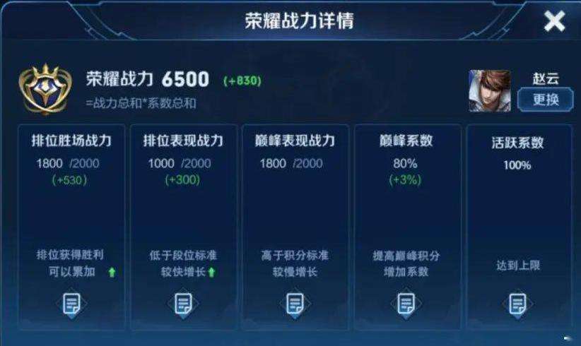 從1200開始,每+20分獲得1%的百分比系數:每增加20積分榮耀戰力加成就會多1%。1220分可以獲得全英雄巔峰加成1%,1240分可以獲得全英雄巔峰加成2%,以此類推2300分可以獲得全英雄巔峰加成55%。