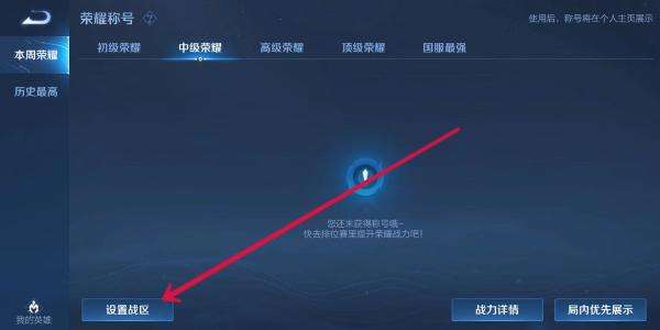 3.設(shè)置戰(zhàn)區(qū):進(jìn)入榮耀戰(zhàn)區(qū)界面后,點(diǎn)擊左下角的“設(shè)置戰(zhàn)區(qū)”選項(xiàng)。此時(shí)游戲會(huì)自動(dòng)定位你當(dāng)前的位置,你也可以在上方的搜索框內(nèi)輸入你想要更改的戰(zhàn)區(qū)位置(比如具體的城市或地區(qū))。