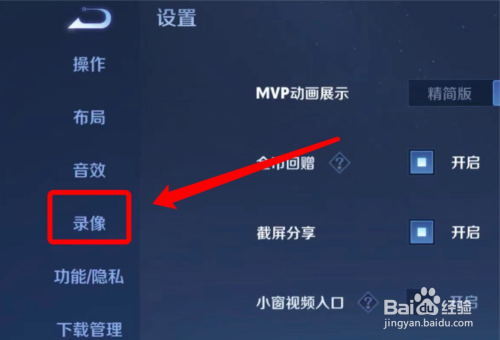 1 打開王者榮耀手游設置頁,進入“錄像”設置界面。