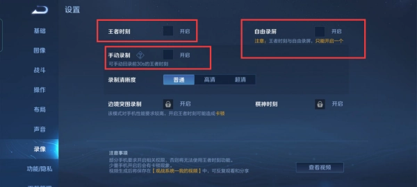 2. 在錄像設置中找到并關閉王者時刻、自由錄屏、手動錄屏功能。
