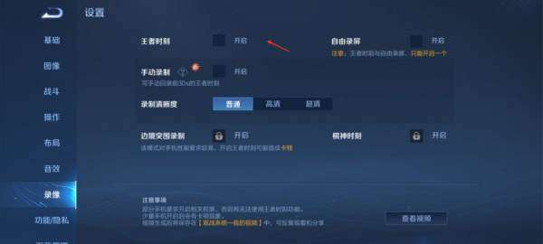 在錄像設(shè)置界面,不要勾選王者時(shí)刻開(kāi)關(guān),這樣就可以關(guān)閉游戲每次啟動(dòng)時(shí)的錄屏提醒
