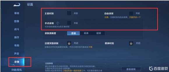 4、在錄像設置中將王者時刻、自由錄屏、手動錄制功能都關閉,這三個功能在運行過程中也會對語音轉文字的識別造成影響。
