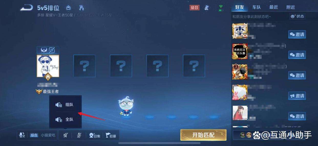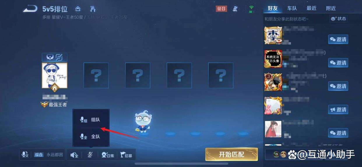 4、在王者榮耀游戲中,開啟語音交流功能,需要首先點擊位于屏幕左上角的麥克風圖標,這將激活語音聊天選項。激活后,你可以選擇不同的語音頻道,包括全隊頻道和組隊頻道。全隊頻道意味著你的所有隊友都能聽到你的聲音,而組隊頻道則僅限于與你一同組隊的玩家能夠收聽到你的語音信息。