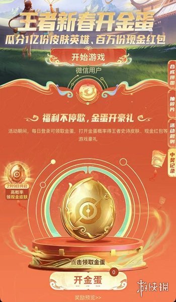 3、活動期間,每日登錄就能領取金蛋,打開金蛋概率獲得史詩皮膚、紅包等獎勵。