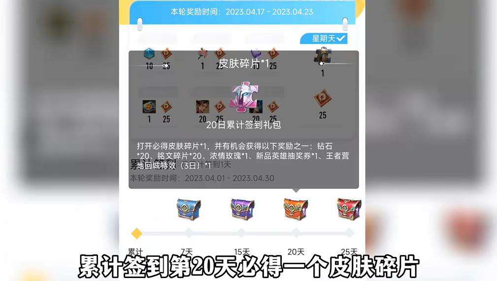 打開王者營地,點擊我上面的每日福利進行簽到,累計簽到第20天,必得1個皮膚碎片,累計簽到第25天,必得1張皮膚抽獎券,打開皮膚抽獎券要么是皮膚,要么是2個皮膚碎片。