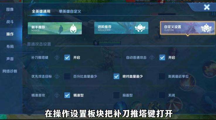 要想玩好后羿,操作設置必不可少,我們打開右上角的設置,在操作設置板塊,把補刀推塔鍵打開,這樣我們在強拆防御塔的時候,就可以點擊推塔鍵快速拆塔,而不是打到塔下的敵方英雄!